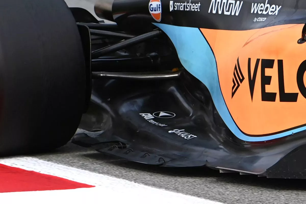 迈凯伦在规则许可范围之内使用了金属支架连接与底板主体分离的翼片,并希望用这种方式影响气流在该部位的走向。同时,底板边缘切口也进行了特殊处理,使其能与L形翼片相契合。