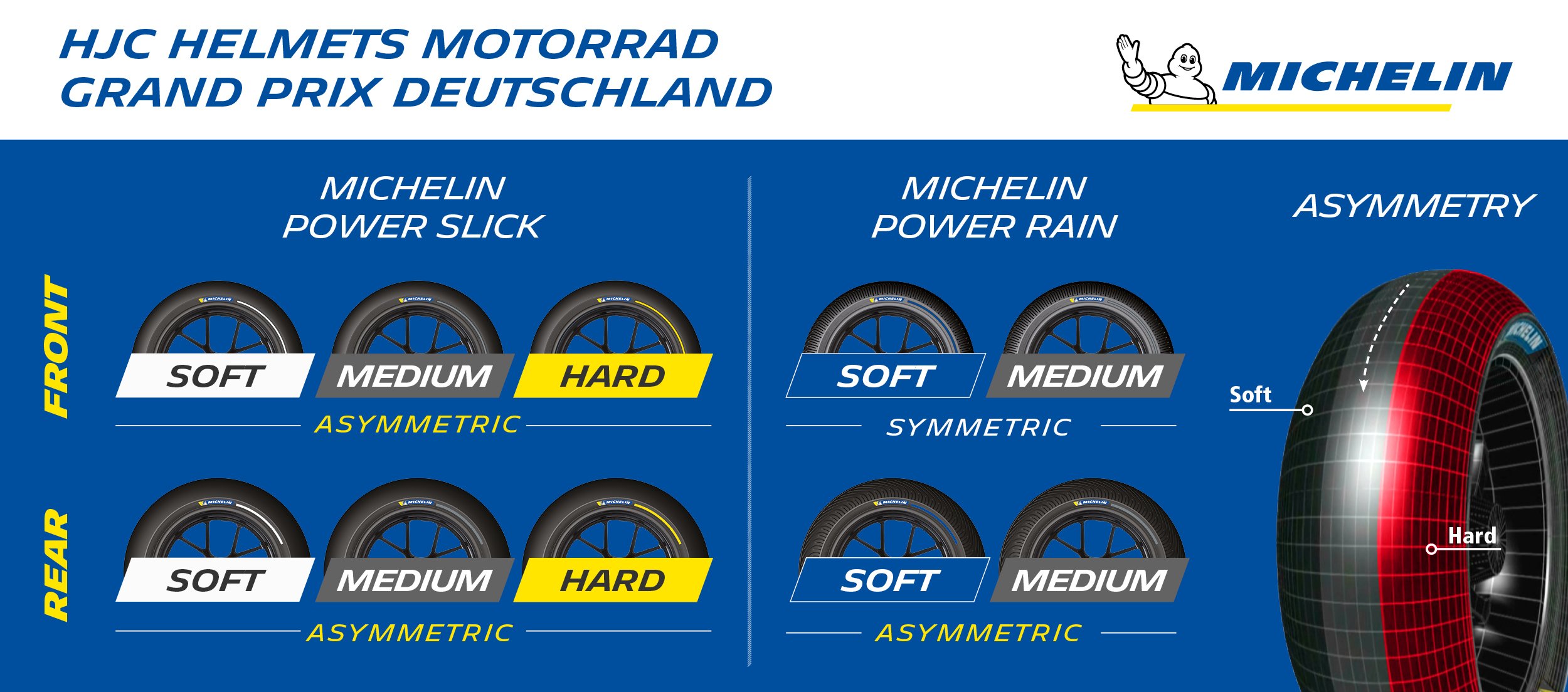 MotoGP组别的轮胎分为干胎和雨胎,其中干胎分为软胎,中胎和硬胎三种配方。雨胎分为软胎和中性胎两种配方。练习或者比赛时,车手可以在前后轮使用不同配方的轮胎驾驶,也可以同时使用干胎和雨胎。
