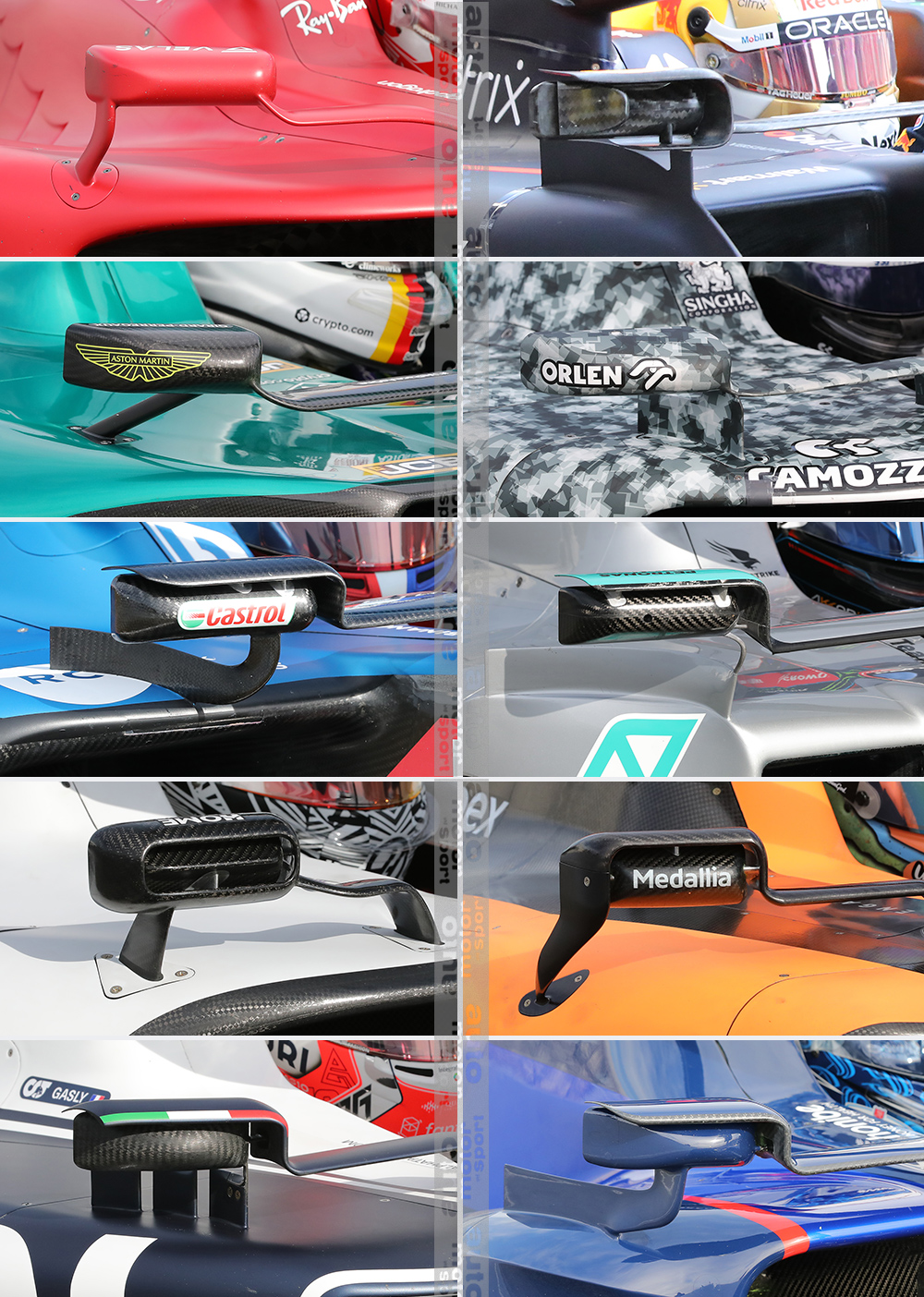 F1 2022年的新赛车设计各不相同,其中一点就是后视镜的设计区别。不同的车队在后视镜形状上各出奇招,带来了很多不同的设计。