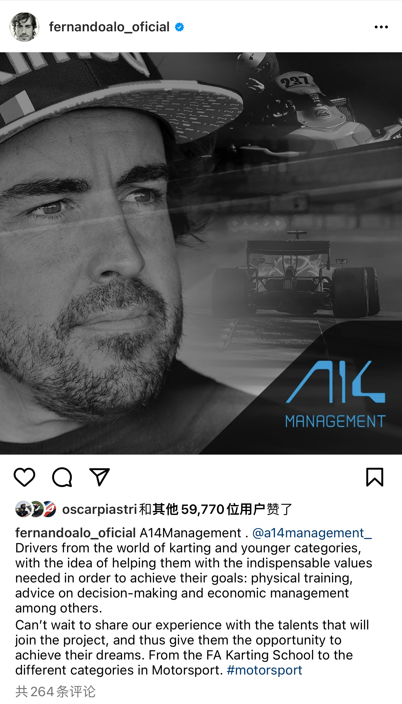 阿隆索最近成立了自己的车手管理项目“A14 management”。这个项目目标是通过体能训练、决策建议和财务管理等手段,帮助年轻车手实现目标。
