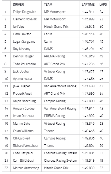 他的队友克莱门特·诺瓦拉克以1分45秒883的成绩获得第二名,这是他第一次参加F2,去年他在F3中获得第三名,尤里·维普斯落后0.1秒排名第三。