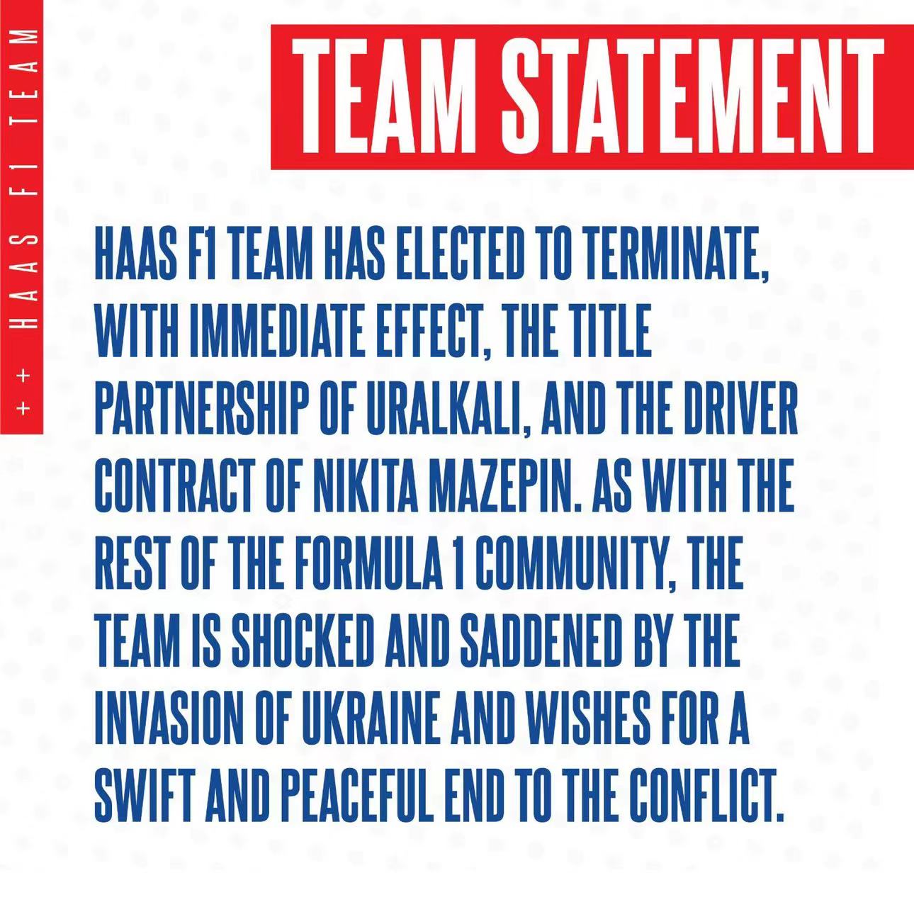 哈斯F1车队决定终止与乌拉尔钾肥的冠名赞助合同和马泽平的车手合同。车队和其他F1的成员一样,对入侵乌克兰感到十分震惊和悲伤,希望冲突可以迅速和平地结束。