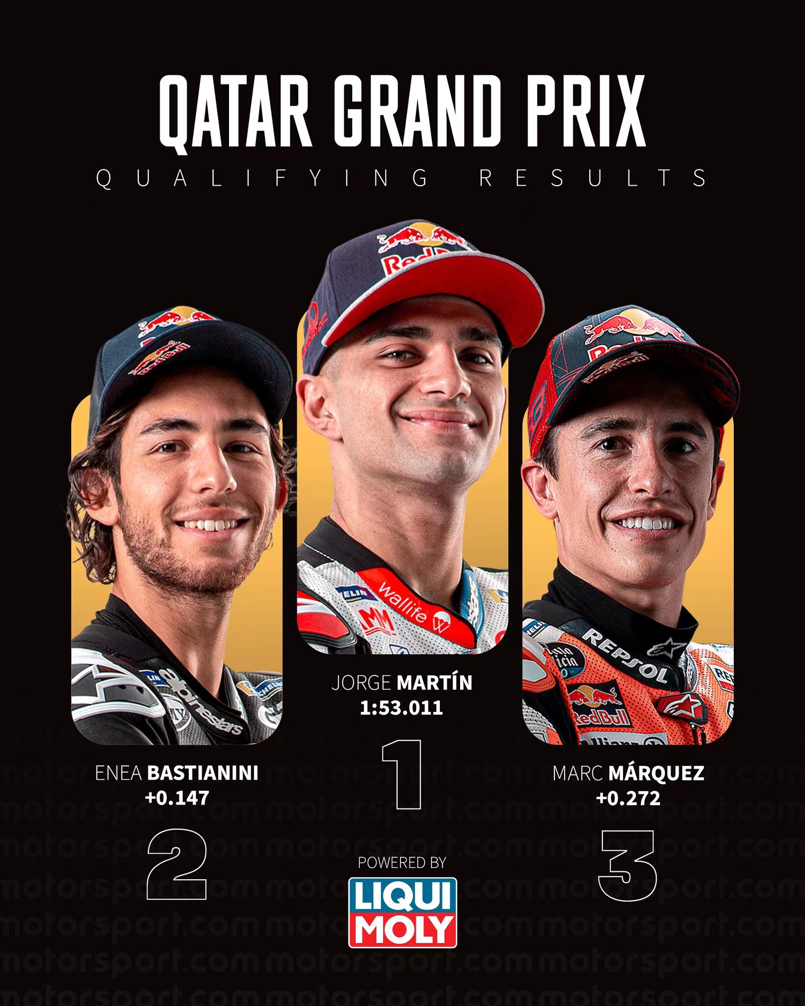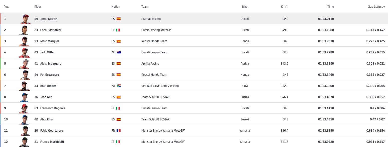 2022年MotoGP卡塔尔大奖赛排位赛结束,两位二年级新秀表现出色。Pramac车队的豪尔赫·马丁拿到杆位,Gresini车队的巴斯蒂亚尼尼第二,本田的马克·马奎斯第三。两位雅马哈车手夸塔拉罗和莫比戴利排名第11和第12。