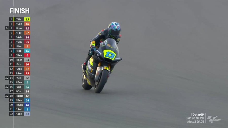 VR46车队的车手瑟莱斯蒂诺·维耶蒂(Celestino Vietti)夺得了2022卡塔尔站Moto2组别的冠军。他也是从杆位一路夺冠。
