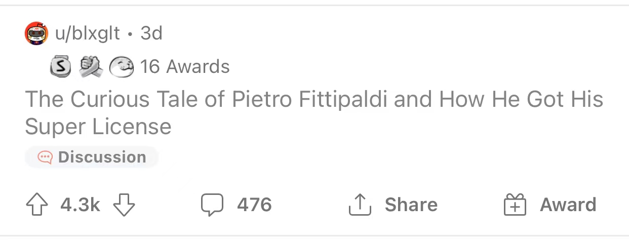 在菲蒂帕尔迪传闻要取代马泽平成为哈斯车队的车手之后,Reddit上的一篇关于“菲蒂帕尔迪如何取得超级驾照”的帖子获得了4300以上的点赞。总结来说就是——他真的运气爆棚。