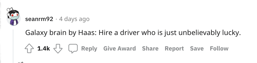 有网友留言说:哈斯的顶级思路:找一个非常非常幸运的车手。