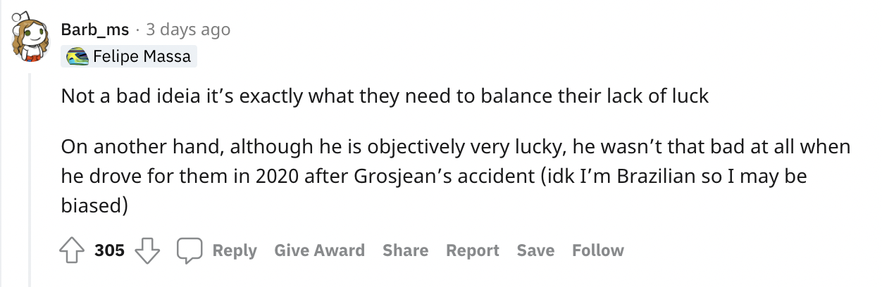还有网友回复:挺好的,刚好可以平衡他们车队的坏运气。而且他替格罗斯让开的两场比赛还可以。