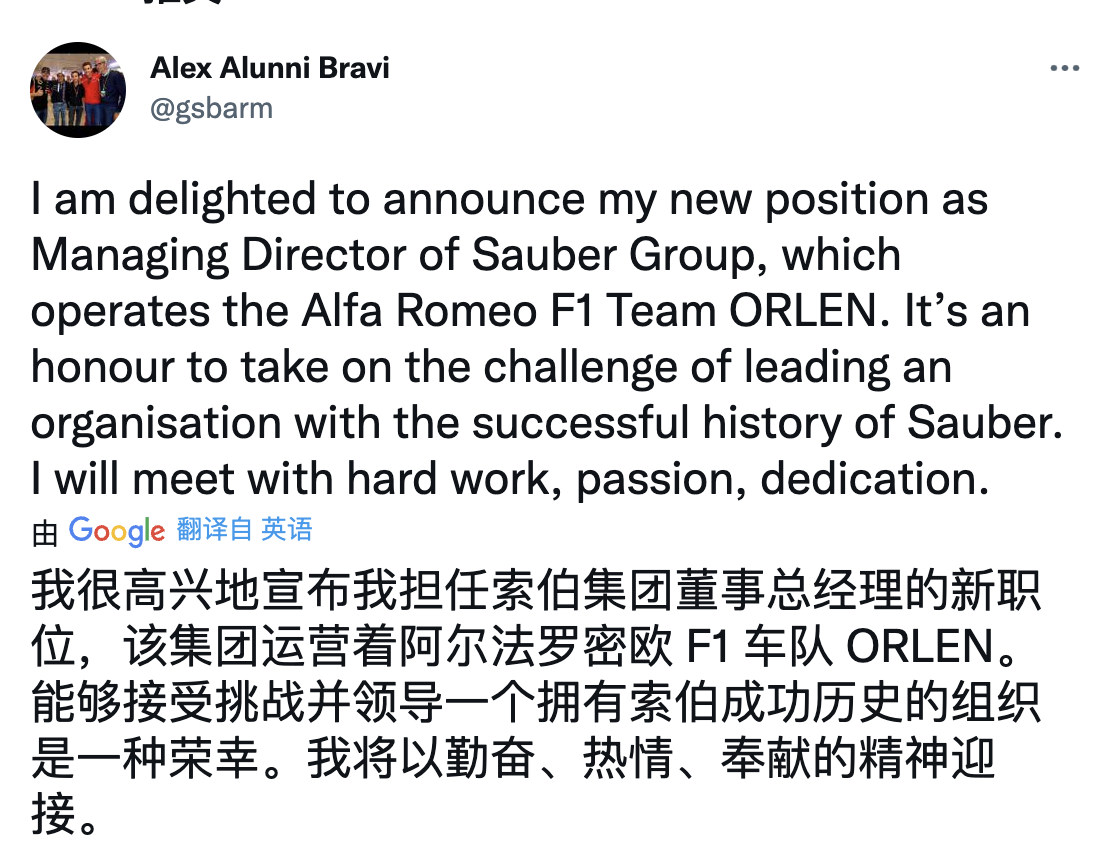 他在自己的推特发布了这一消息。Bravi此前也一直是索伯集团管理层的成员。