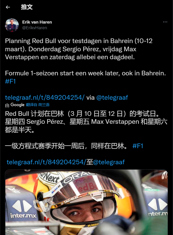 据荷兰体育媒体Telesport记者@Erik van Haren报道:在周四的巴林冬测,红牛会安排佩雷兹出场,周五是维斯塔潘,最后一天为两位车手各开半天。