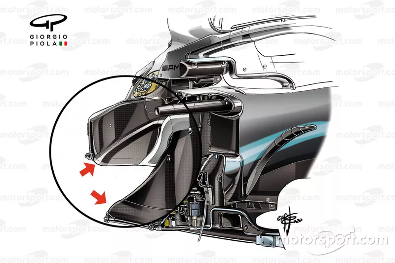 虽然完全取消侧箱的想法看起来并不现实,但我们有充分的理由相信梅奔将会采用一种全新的侧箱设计。新的侧箱将使W13的腰部急剧收窄,比巴塞罗那测试中车队给出的方案要激进得多。