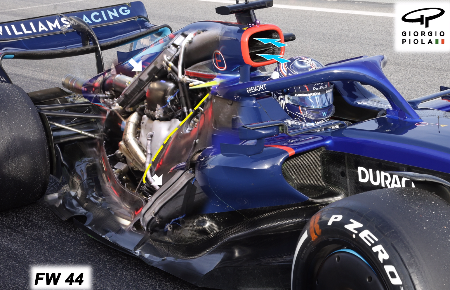 作为该设计的一部分,侧箱的整体宽度将取决于防撞梁。防撞梁的存在不容忽视,且在一定程度上需要变得更加公平。例如FW44的侧箱设计就采用上部防撞梁本身作为进气道的导流版,人为分割进入进气道的水平气流。