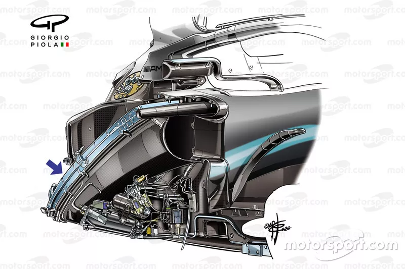 在过去的几年中,梅奔在该区域内采用了一个非常有趣的设计。通过在底盘下挖的方式使散热器半埋在底盘中,由此来减小侧箱体积。W13可能也采用了相同的设计。