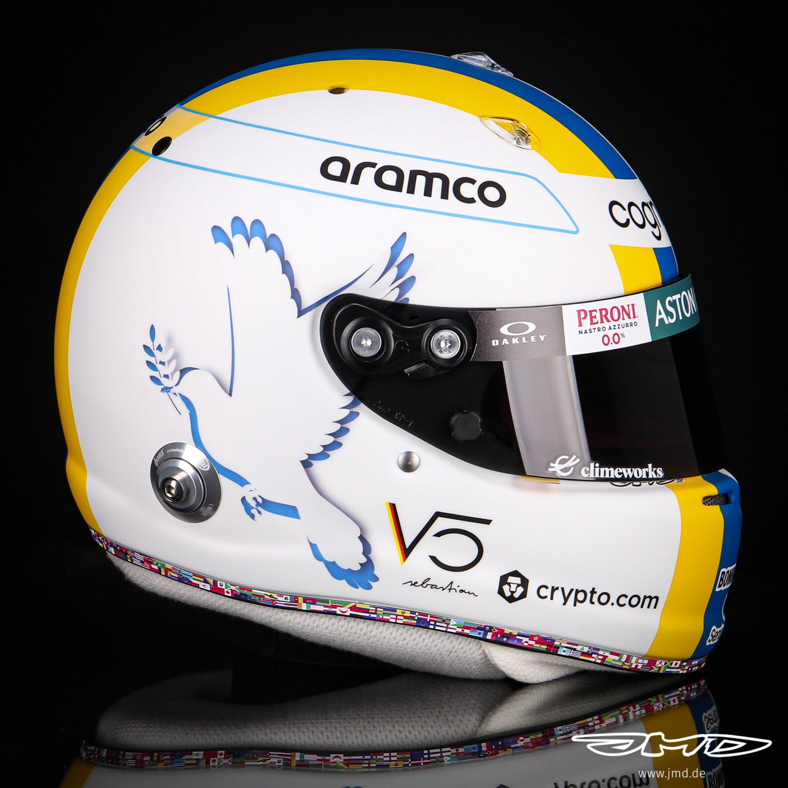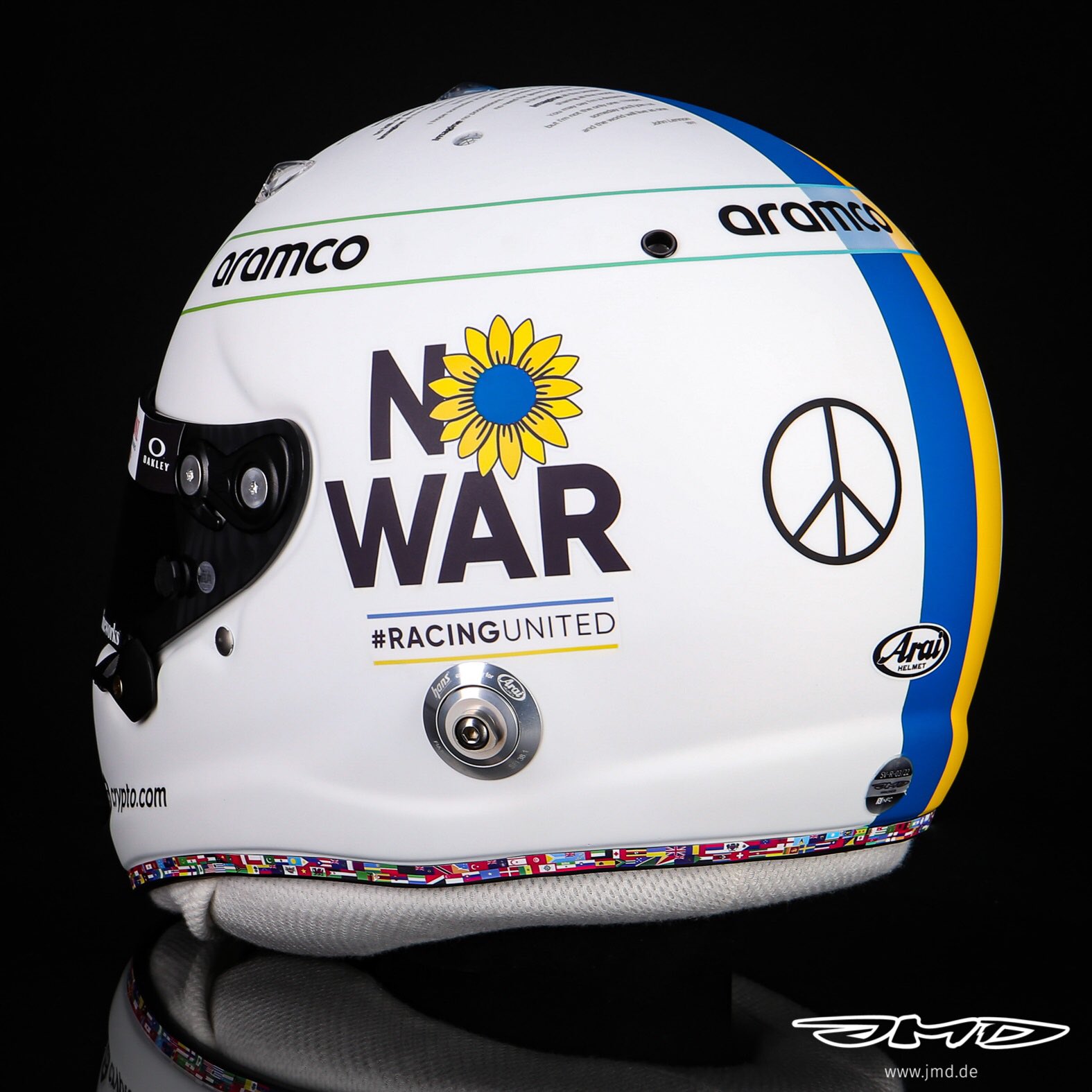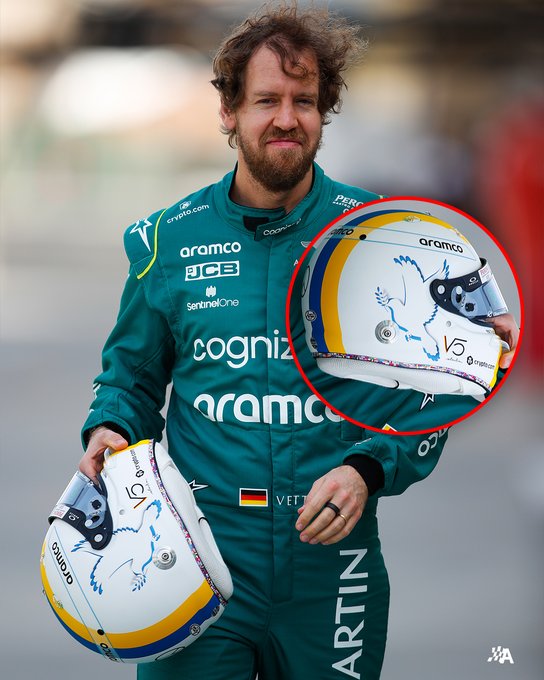 维特尔在测试中使用了纪念乌克兰的头盔新涂装,头盔上有和平鸽。