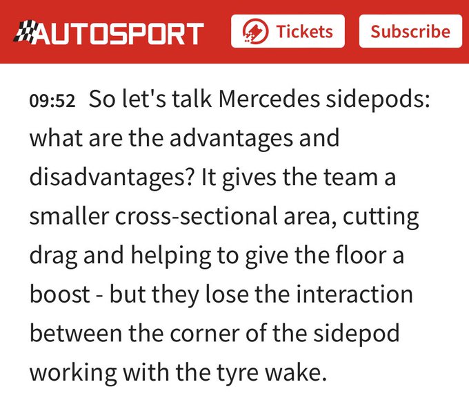 Autosport分析了W13新侧箱的优点:它让赛车的横截面积更小,减小了阻力,让地面效应更加容易发挥。