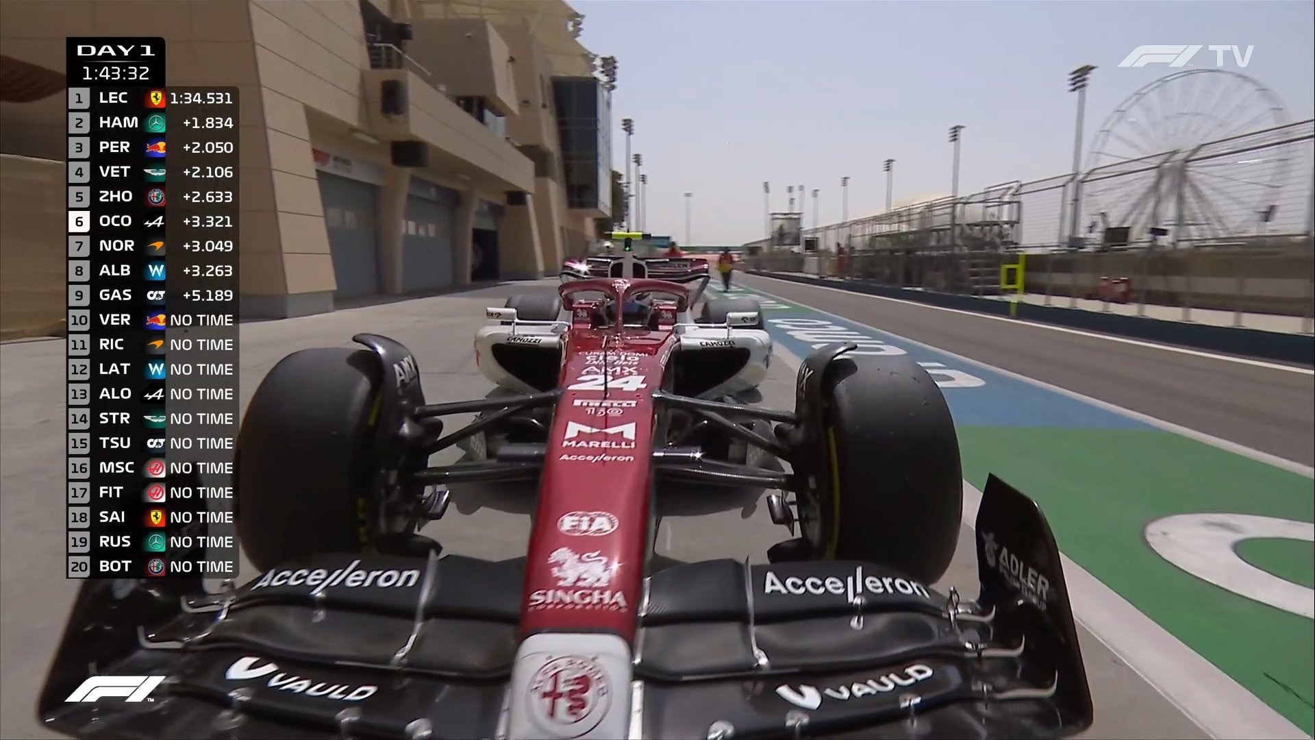 周冠宇的赛车停在了维修区。他的车停在梅赛德斯的P房前,阿尔法罗密欧的技师需要出来把车推回去。