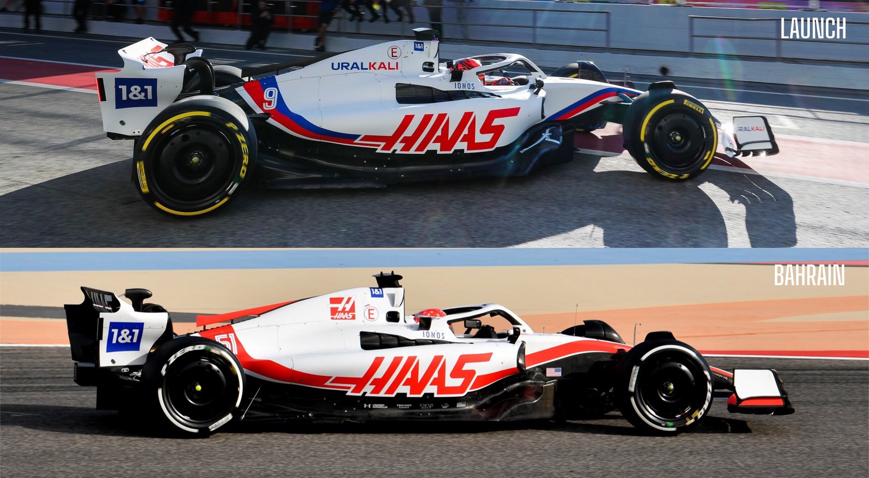 对比哈斯在巴塞罗那与巴林测试中的涂装,可以看到哈斯把冠名赞助商乌拉尔化工,以及白蓝红的颜色清除掉了。在侧箱靠前的位置,哈斯增加了一面美国国旗。