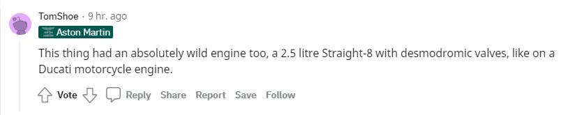 @TomShoe:那辆车也有怪兽一样的引擎,2.5升直列8缸(小编注:该引擎为2.5升V8,并配备机械增压)简直像杜卡迪的引擎