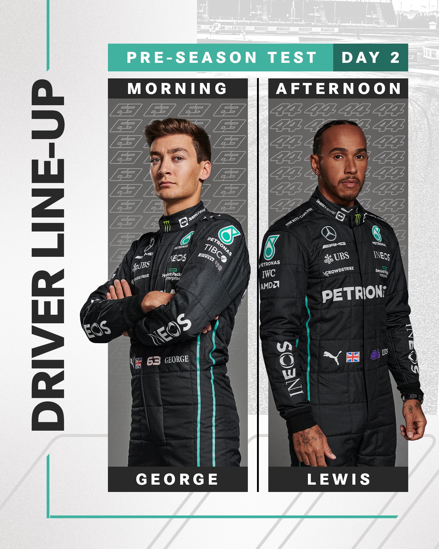 梅赛德斯在官方推特上公布了其巴林冬测第二日的车手阵容。上午场的测试将由拉塞尔担任车手,下午场将会是汉密尔顿。