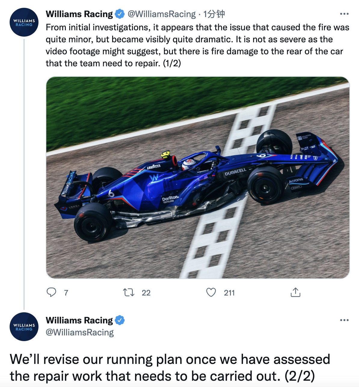 威廉姆斯公布了初步调查结果,表示引发火灾的问题其实非常小,并不像画面展示得那么严重。