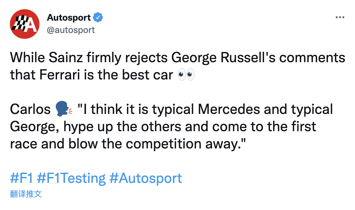 而塞恩斯回复道:“这就是典型的梅赛德斯和乔治(拉塞尔),先把别人都吹到天上去,然后一开赛直接杀死比赛。”