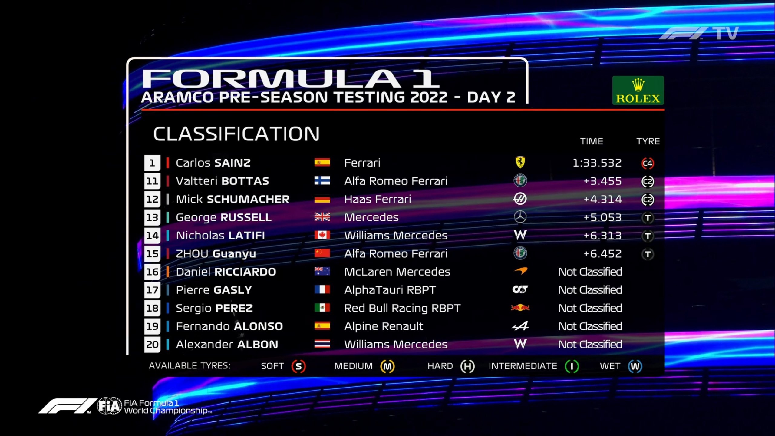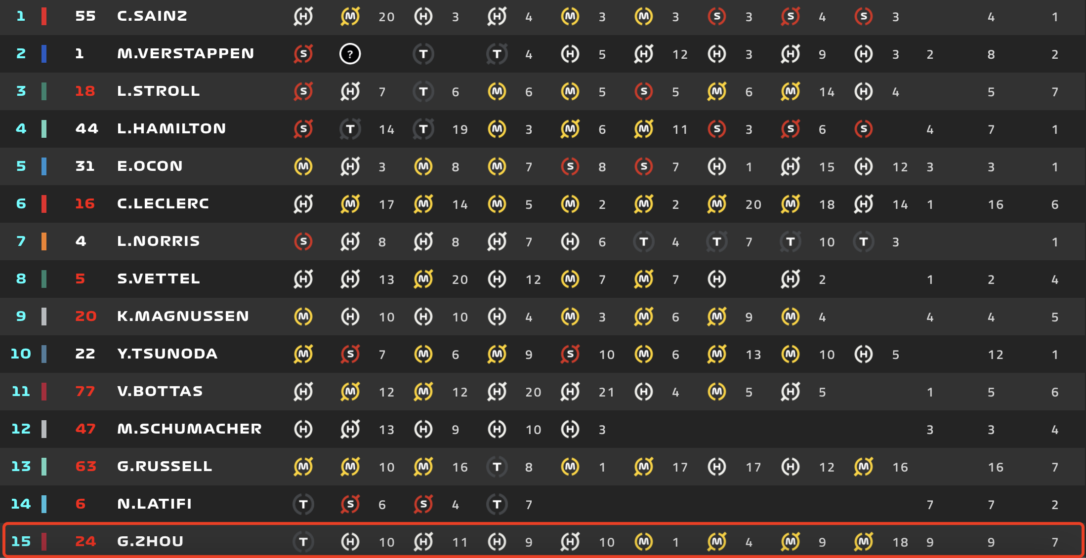 从周冠宇的轮胎使用情况,就能看出这一点:周冠宇使用的都是硬胎、中性胎和C2测试胎。并没有像其他人一样,使用C4、C5的软胎。
