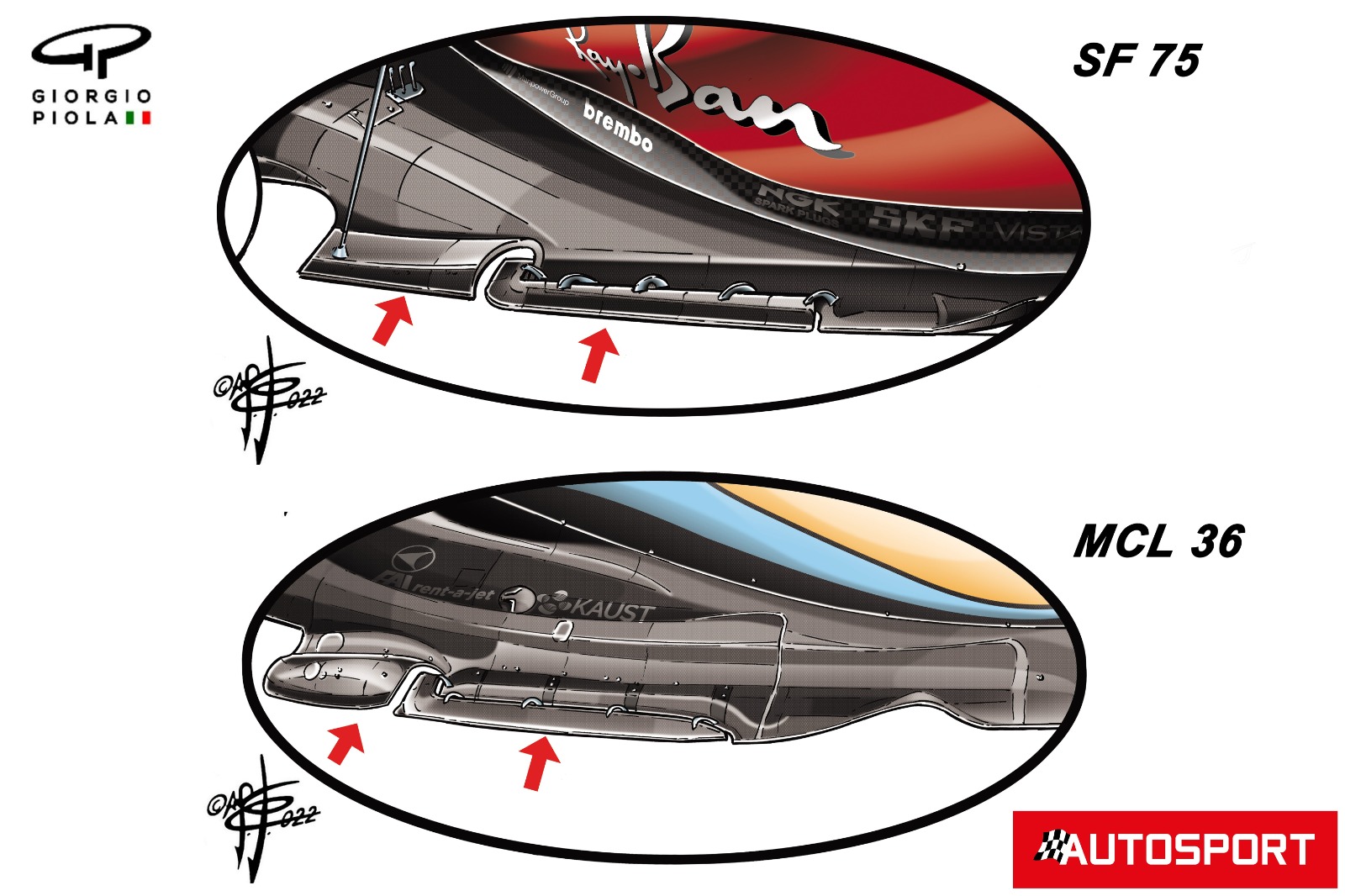 此外,红色箭头显示,之前车队在底盘边缘使用的波浪形部分,到最近测试时变得更加简单。而和其他车队相比,梅赛德斯的底盘边缘设计也较为简单。法拉利等车队(下图)通过增加边缘翼片,来增加底盘的稳定程度,而且这一方法是在规则允许范围内。