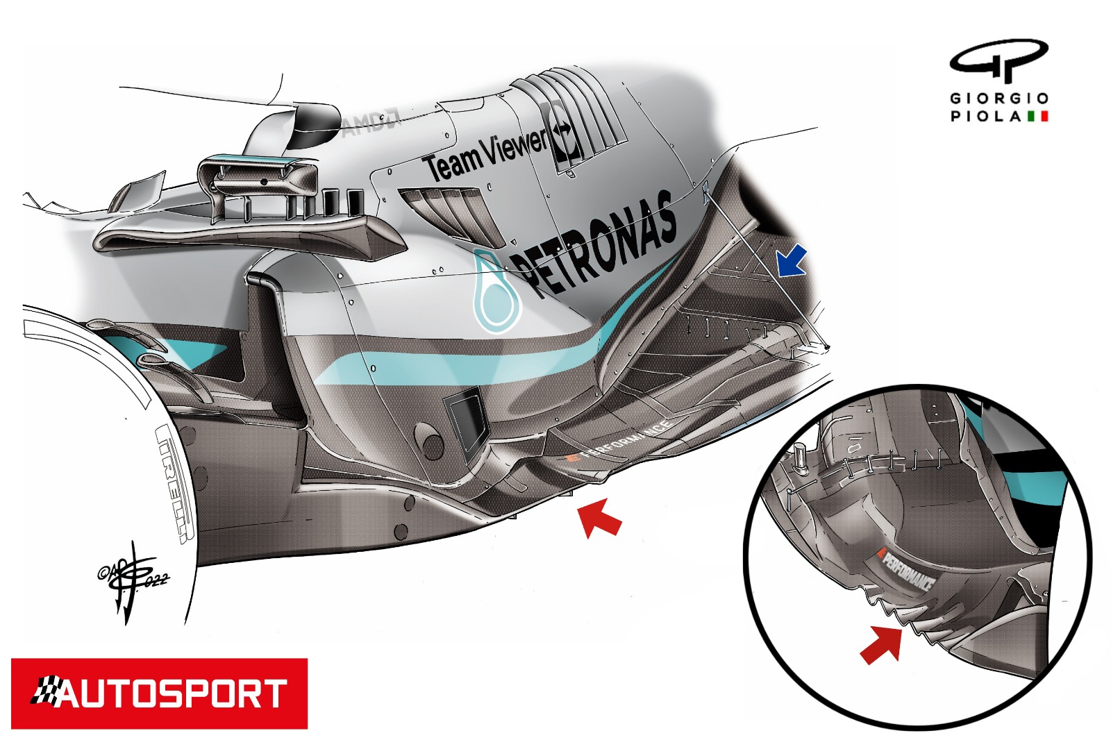 此外,蓝色箭头还显示梅赛德斯给赛车增加了一个稳定装置,从而阻止底盘边缘活动幅度过大。