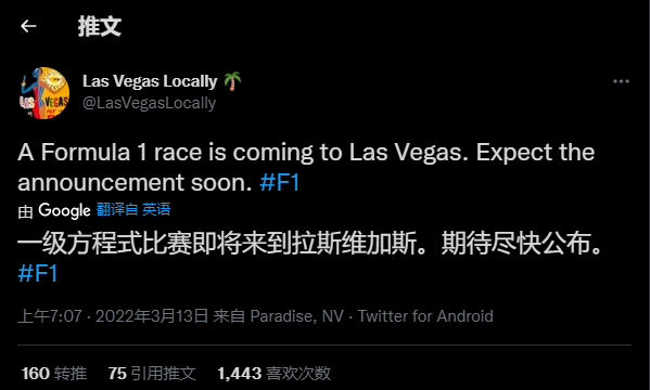 近些天,F1将在美国举办第三站,即拉斯维加斯大奖赛的传闻越来越多。今天拉斯维加斯本地旅行博主,坐拥接近20万粉丝的@Las Vegas Locally发布推特:F1大奖赛将来到拉斯维加斯,希望能赶快官宣。
