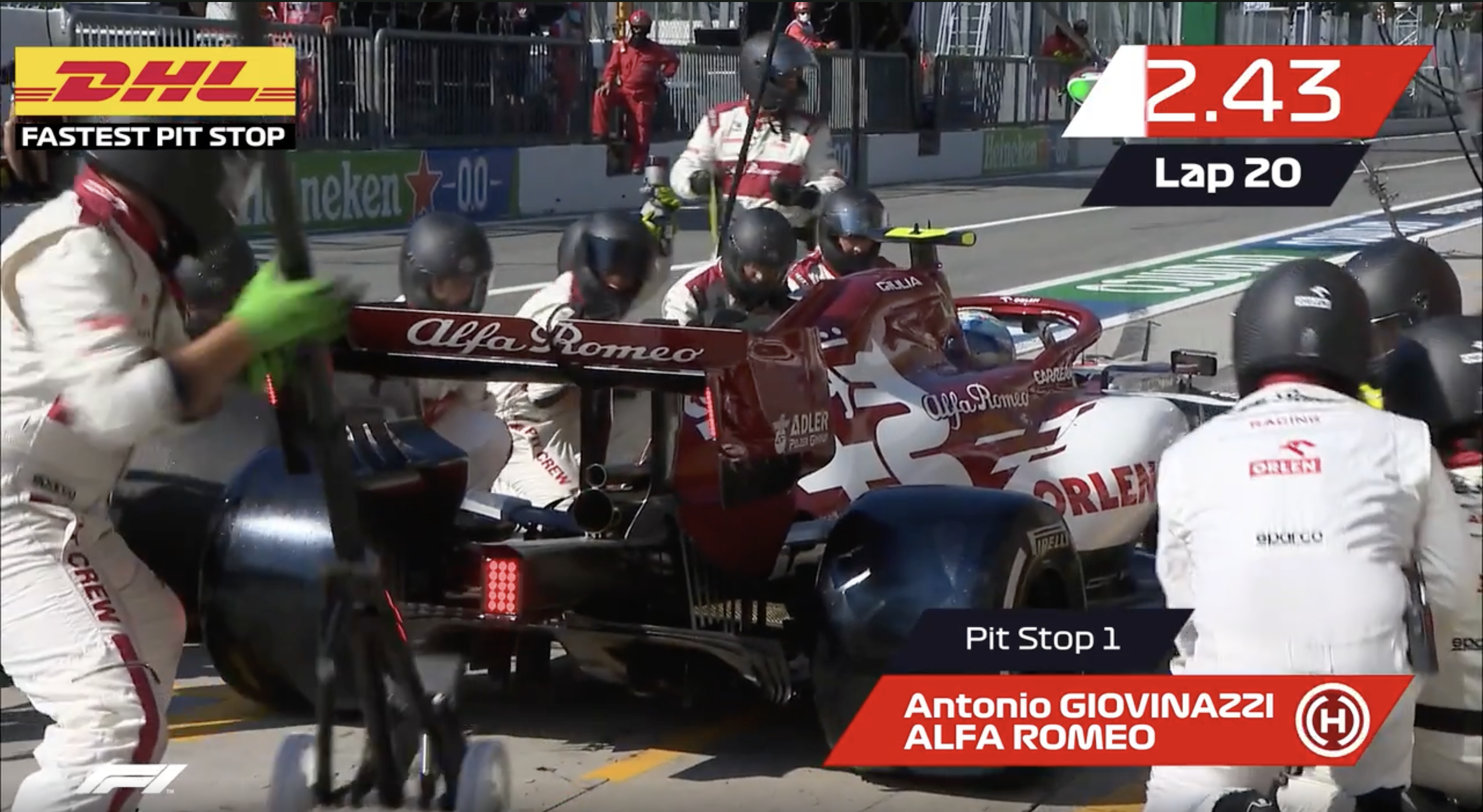 答案公布:是阿尔法罗密欧车队!吉奥维纳兹以2.43秒的进站速度取得了意大利蒙扎站的DHL进站冠军!