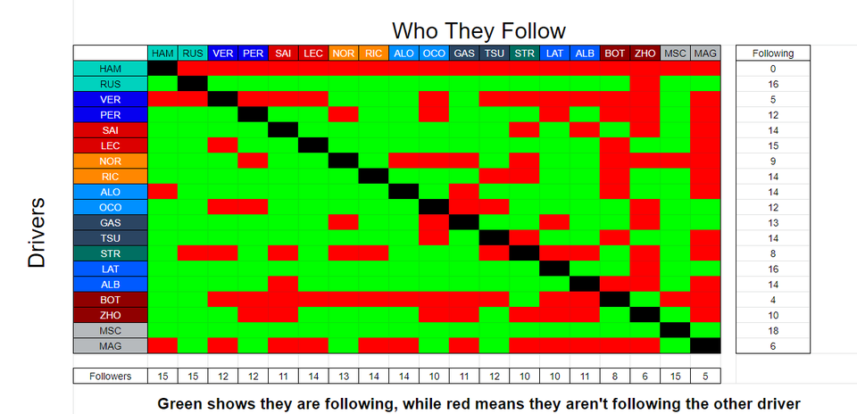 其中,绿色表示关注,红色表示未关注。最右侧的数字表示该车手共关注了多少位其他车手(其中拉提菲应该为17),最下面的数字表示该车手共被多少位车手关注。