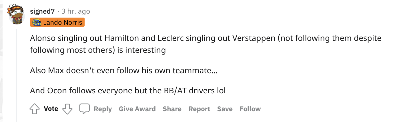“阿隆索不关注汉密尔顿,勒克莱尔也不关注维斯塔潘(他们关注了其他大多数车手),有意思。