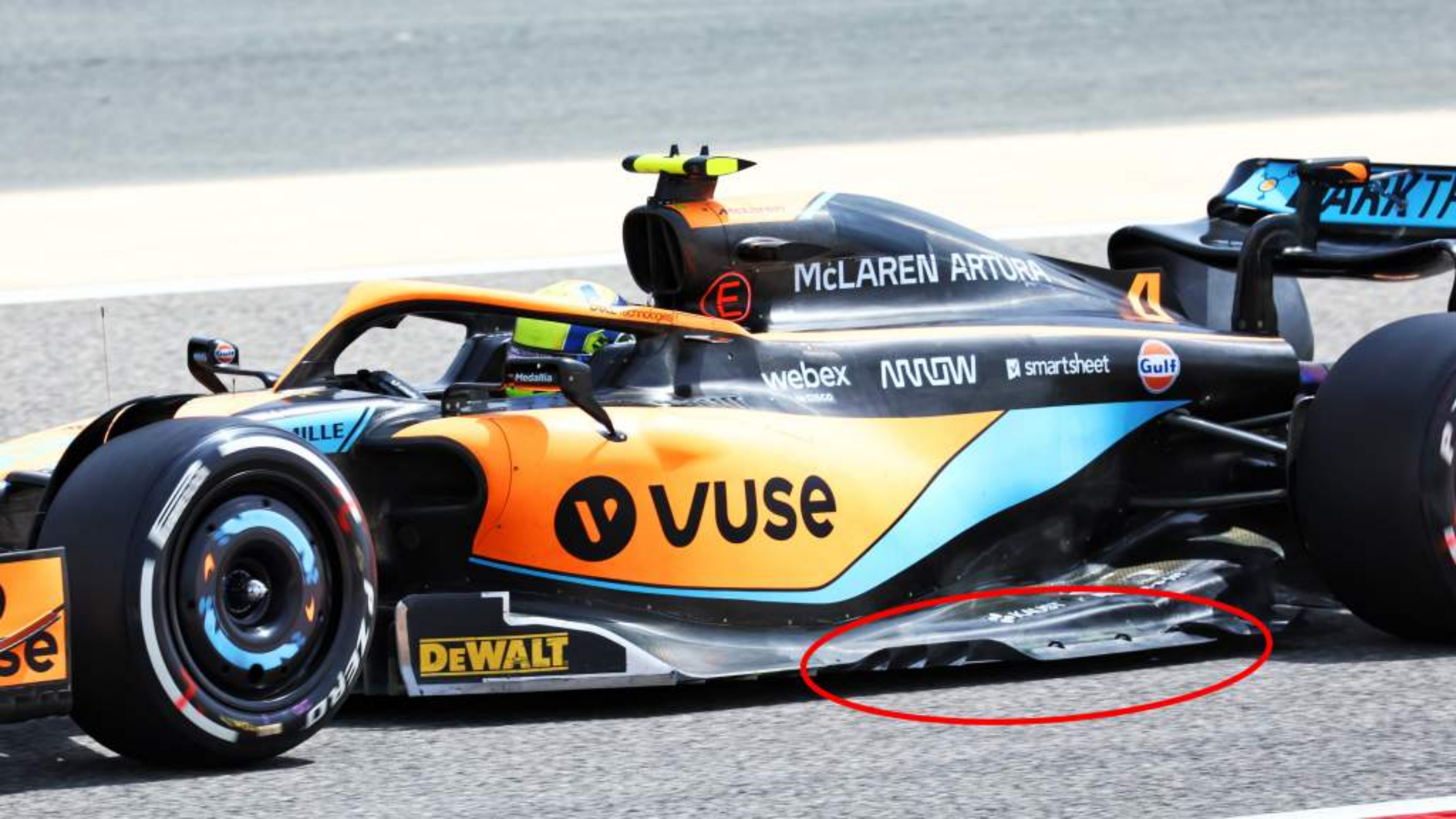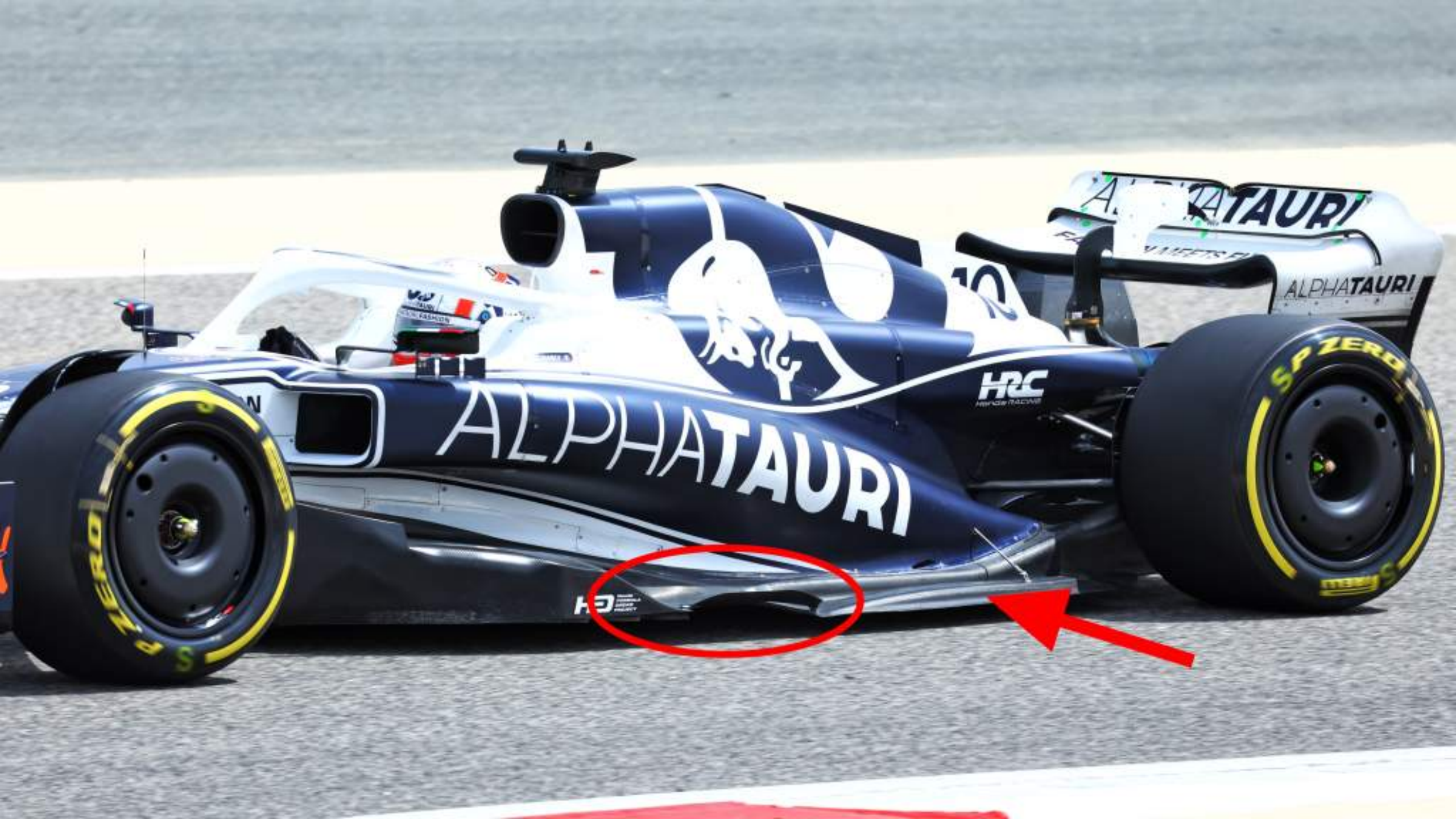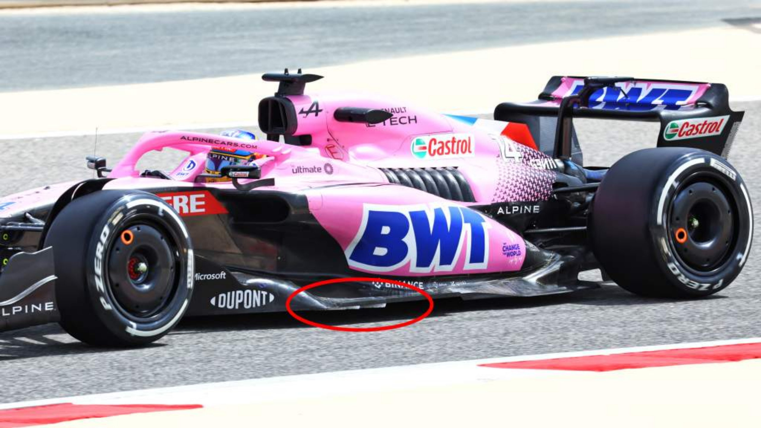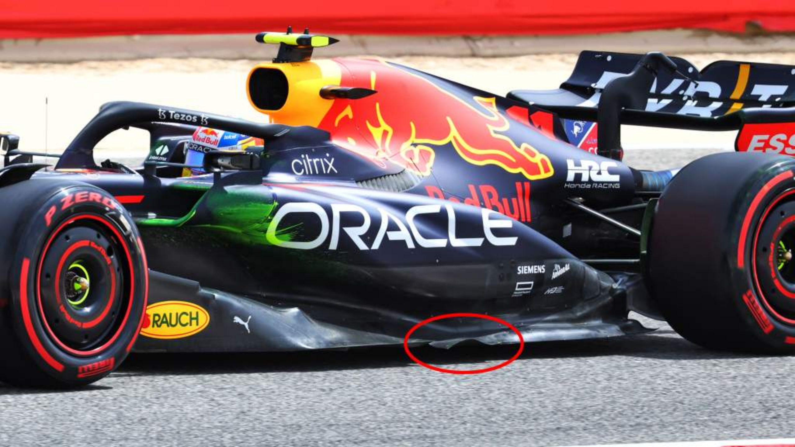 红牛二队也正在尽可能地让底板前角投入工作,你可以看到外侧转向叶片(红色椭圆)与其小槽隙以允许涡流的产生。