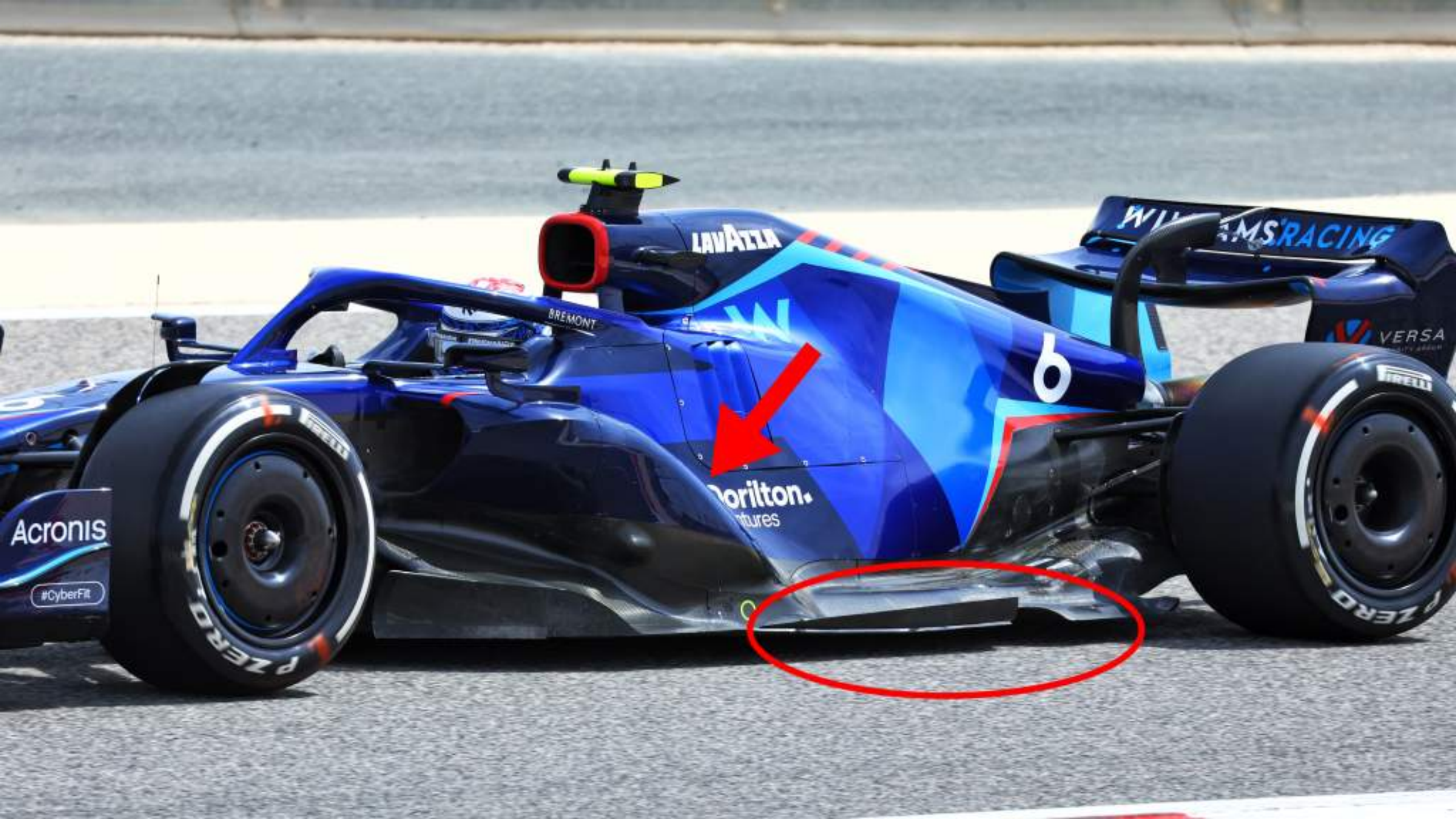 威廉姆斯的设计与梅赛德斯非常相似,但更令人关注的是侧箱下切(红色箭头)。我不确定在这个区域发生气流分离时空动效应会如何作用,我相信威廉姆斯会对此进行研究,并且相信这种设计是有效的,但是我仍然持质疑态度。