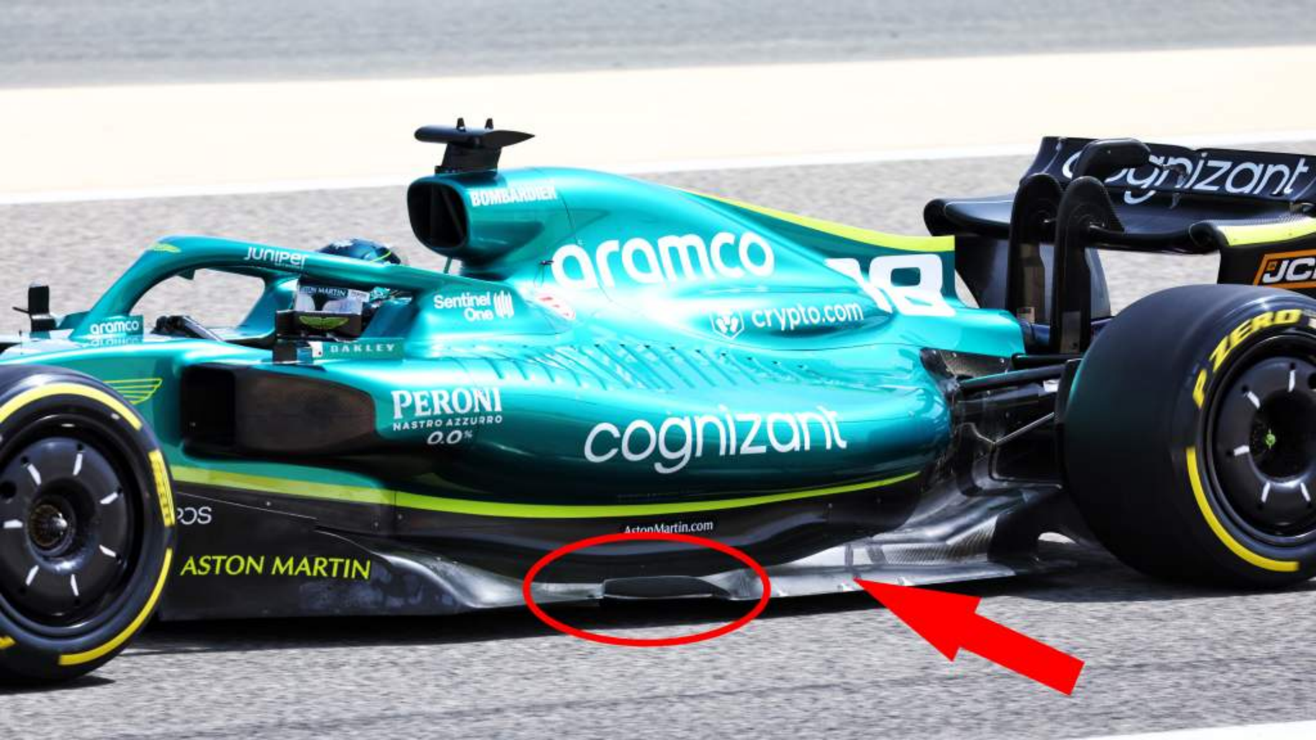 底板外缘的细节比红牛更引人注意,上调部分(红色椭圆)和该区域的小分流器都是为了清除从前角下流出的气流并增强所需的涡流,来进一步密封后方的底板,同时还有小缝隙水平翼段来维持这些涡流。