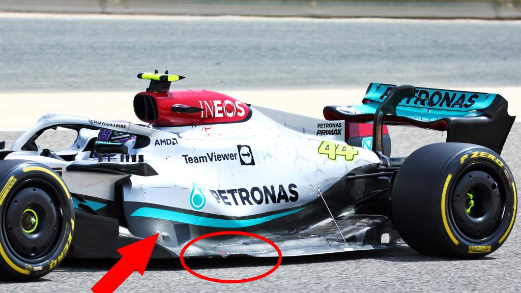 梅赛德斯甚至增加了一个支撑点来支持底板的后角,为了确保底板不会弯曲太多。赛车调校得很硬,所以所有的这些尝试都是为了避免底板真的接触到地面而导致的可怕的“海豚跳”现象。