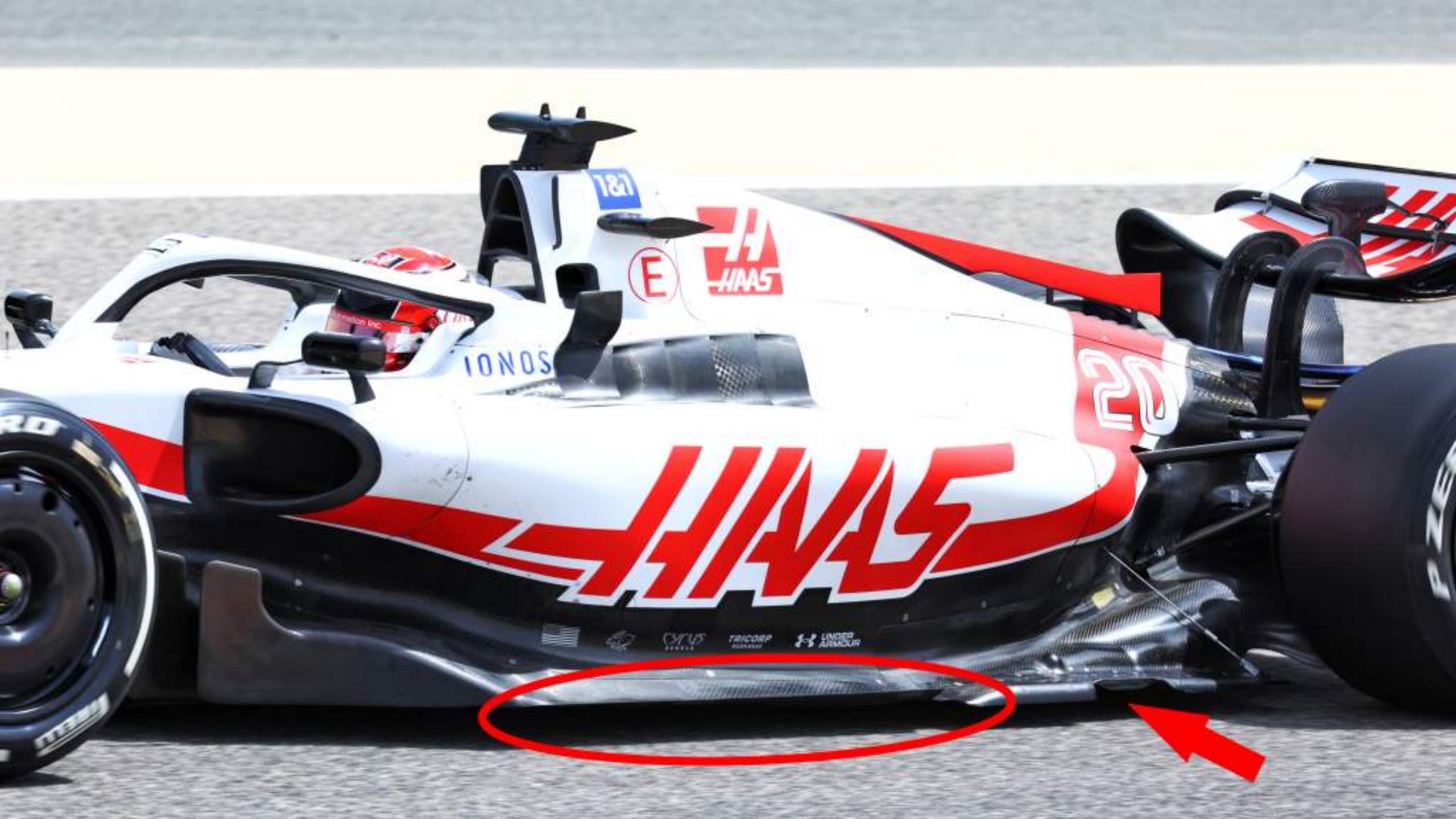 哈斯有一个长锥形的底板前缘(红色椭圆)允许这个区域顶部的气流尽可能多的抵消底板前角的气流,然后凸起的部分(红色箭头)连接到后轮前的这个区域,赛车还有一个底板支架支撑后角。