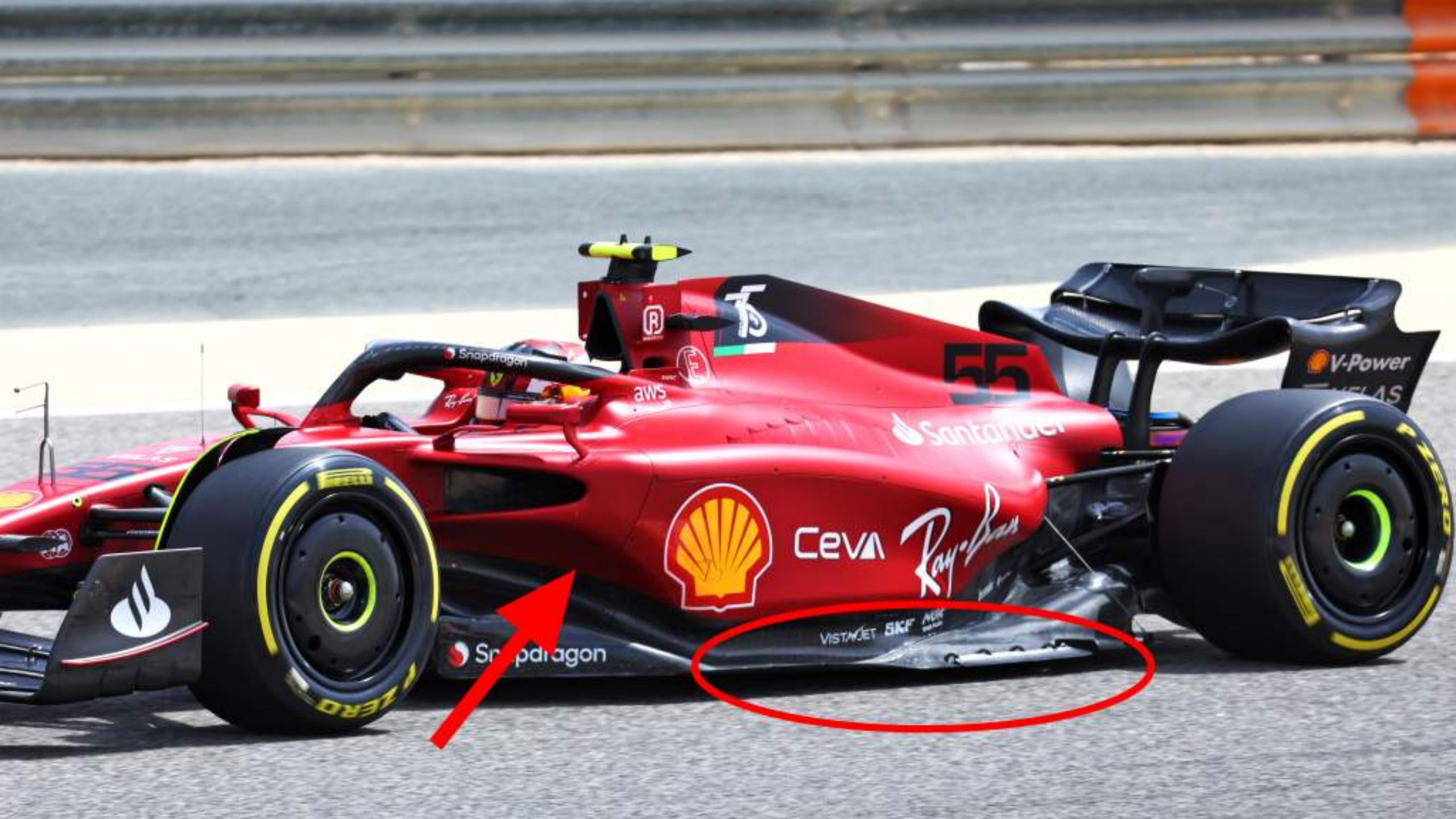 法拉利斜率很大的侧箱底部(红色箭头)区域存在外洗,这有助于前角底面发挥作用,小而弯的外缘(红色椭圆)将会产生涡流。