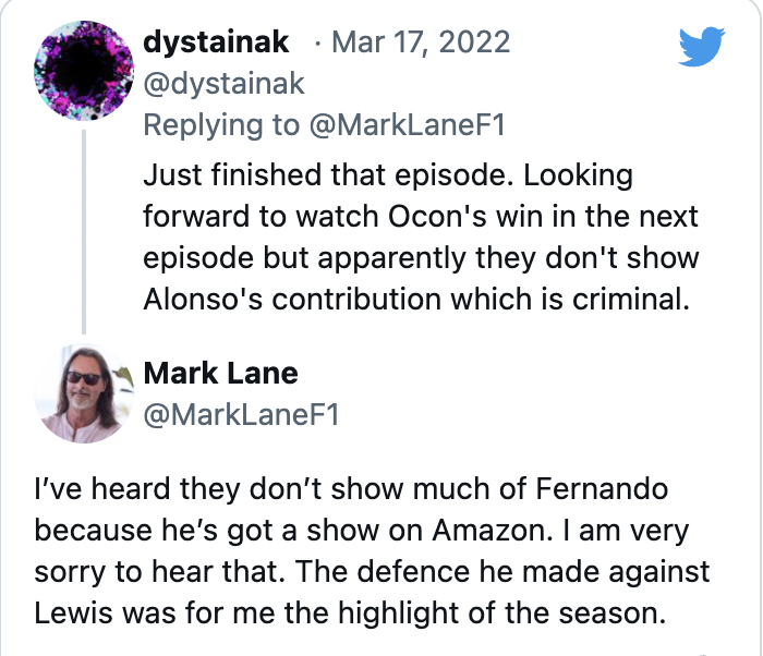 F1空气动力学设计师Mark Lane回复到,他听说是因为阿隆索在亚马逊会有剧集上线,所以Netflix才没有给西班牙车手太多镜头。