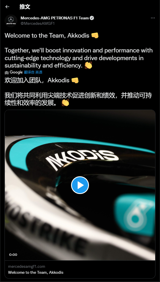 据梅赛德斯车队推特,他们官宣了科技公司Akkodis将作为车队的新的合作伙伴。
