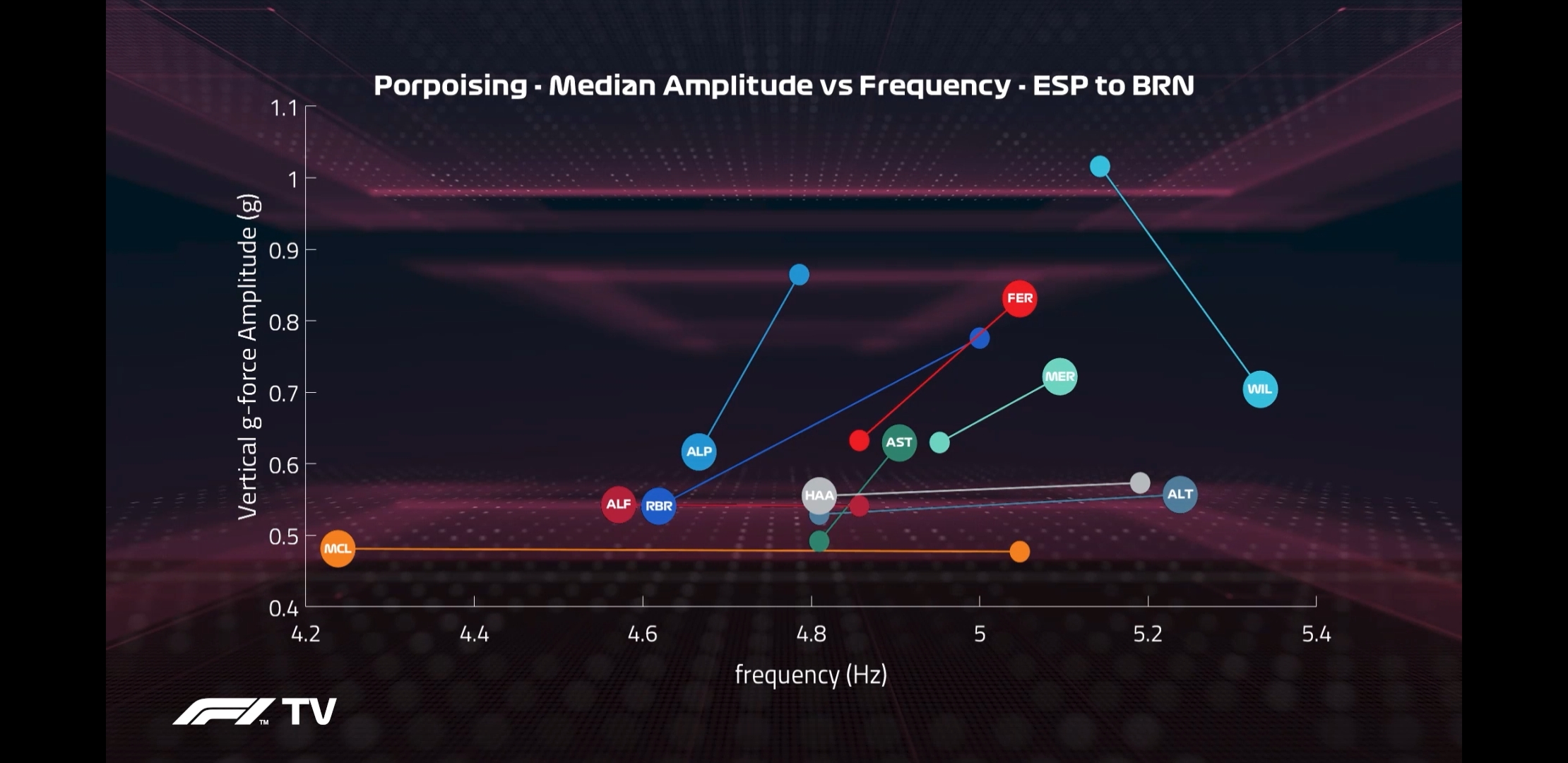 F1TV中对巴塞罗那和巴林两次测试中的“海豚跳”情况做了对比。较小的点是巴塞罗那站的情况,较大的点是巴林站的情况;横轴越往右表示颠动出现的情况越频繁,纵轴越往上表示颠动情况越严重。