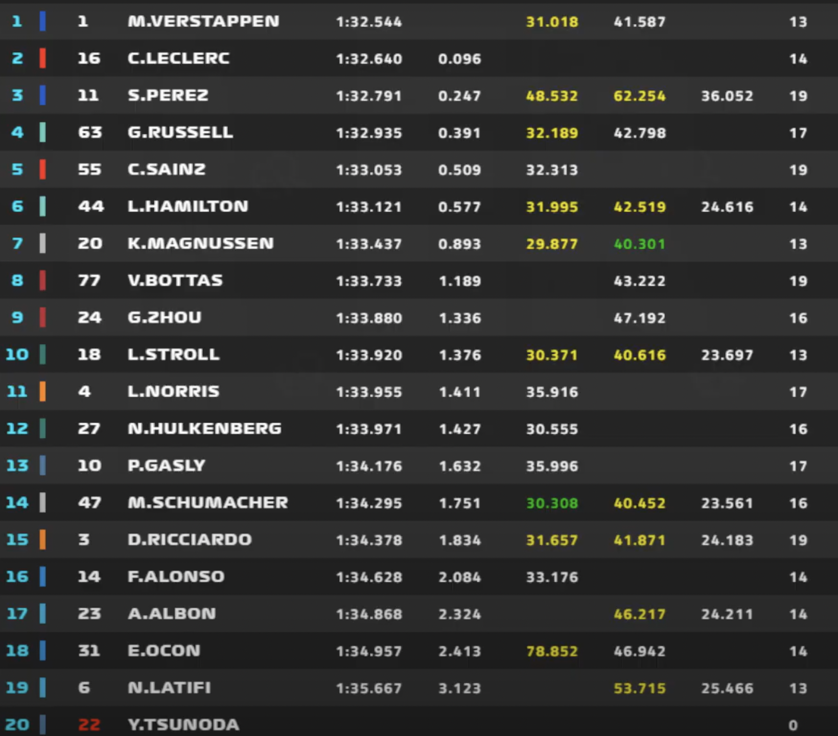 三练总体进行比较平稳,全场始终没有刷新昨天练习赛的最快圈,最终维斯塔潘以1:32.544的成绩排名第一,法拉利车手勒克莱尔落后0.096秒排名第二,佩雷兹排在第三。梅赛德斯两位车手分别排在场上第四和第六。