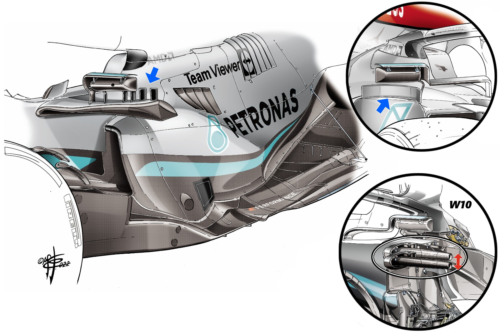自2017年规定再次更新以来,车队普遍选择将上部侧向防撞梁安装在较低的位置(如图所示,以梅奔W10为例)。这样的设计可以让防撞梁与侧箱主体分开,更好地梳理前轮气流,同时有利于缩小进气道开口大小。