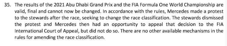 根据FIA报告第35条第一句话:2021年阿布扎比大奖赛以及FIA世界一级方程式锦标赛冠军是有效的、最终的、不能更改的。梅赛德斯的申诉被驳回。