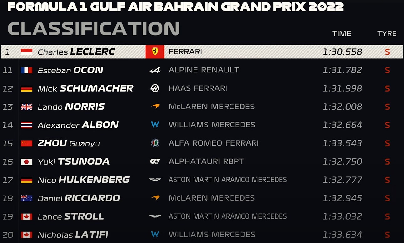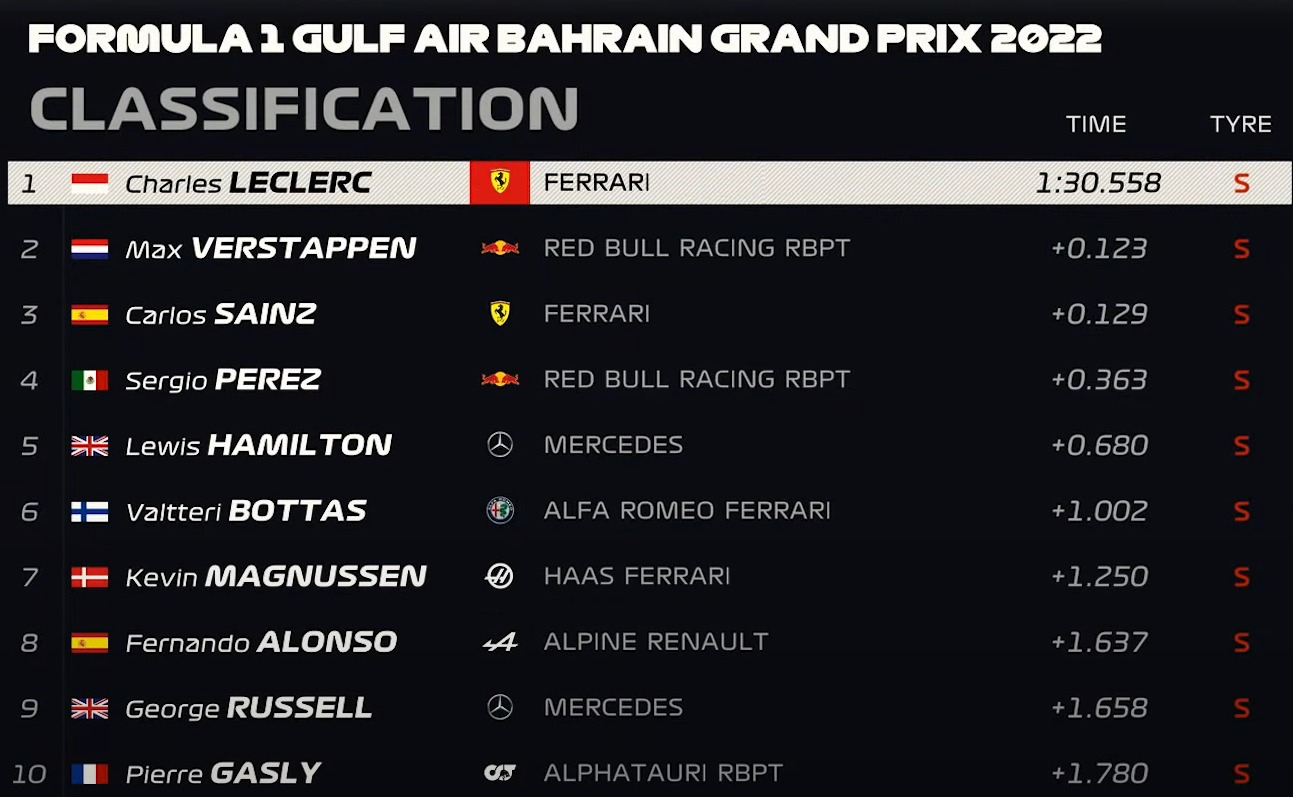 勒克莱尔在Q3最后阶段刷到第1,做出1:30.558的成绩,维斯塔潘也将成绩提升,排在场上第2,仅落后0.123秒。另一位法拉利车手塞恩斯以0.006秒的微弱优势排在第3名。