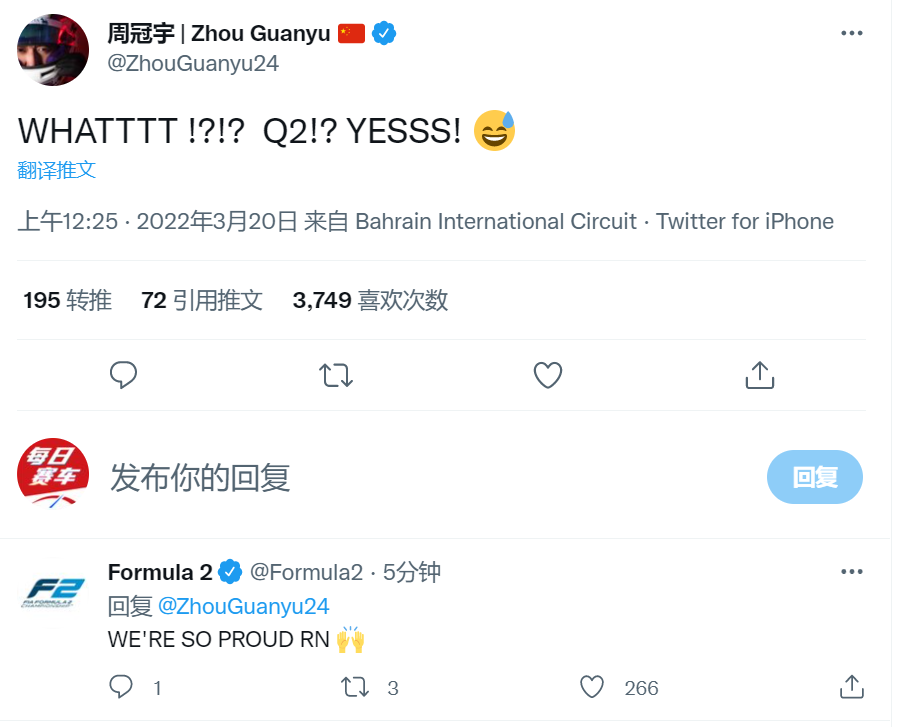 结束自己的第一场F1排位赛,周冠宇发推:什么,Q2!棒啊!