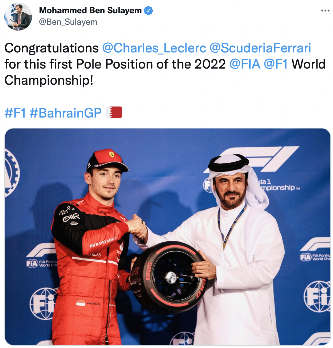 排位赛后,FIA主席给勒克莱尔颁发了杆位小轮胎,并在社交媒体发文称:祝贺勒克莱尔和法拉利取得了2022赛季首个F1杆位!