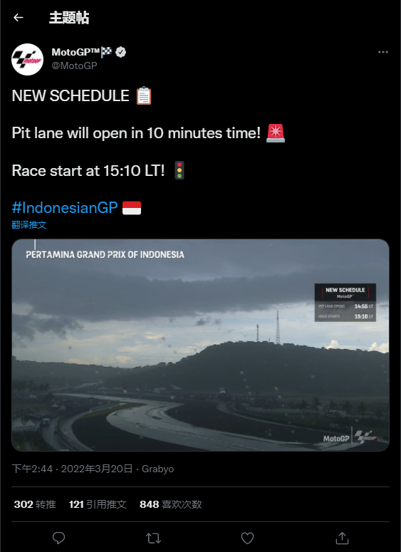 根据MotoGP官方推特,由于雨势过大,本场印度尼西亚大奖赛将推迟至15:10开赛