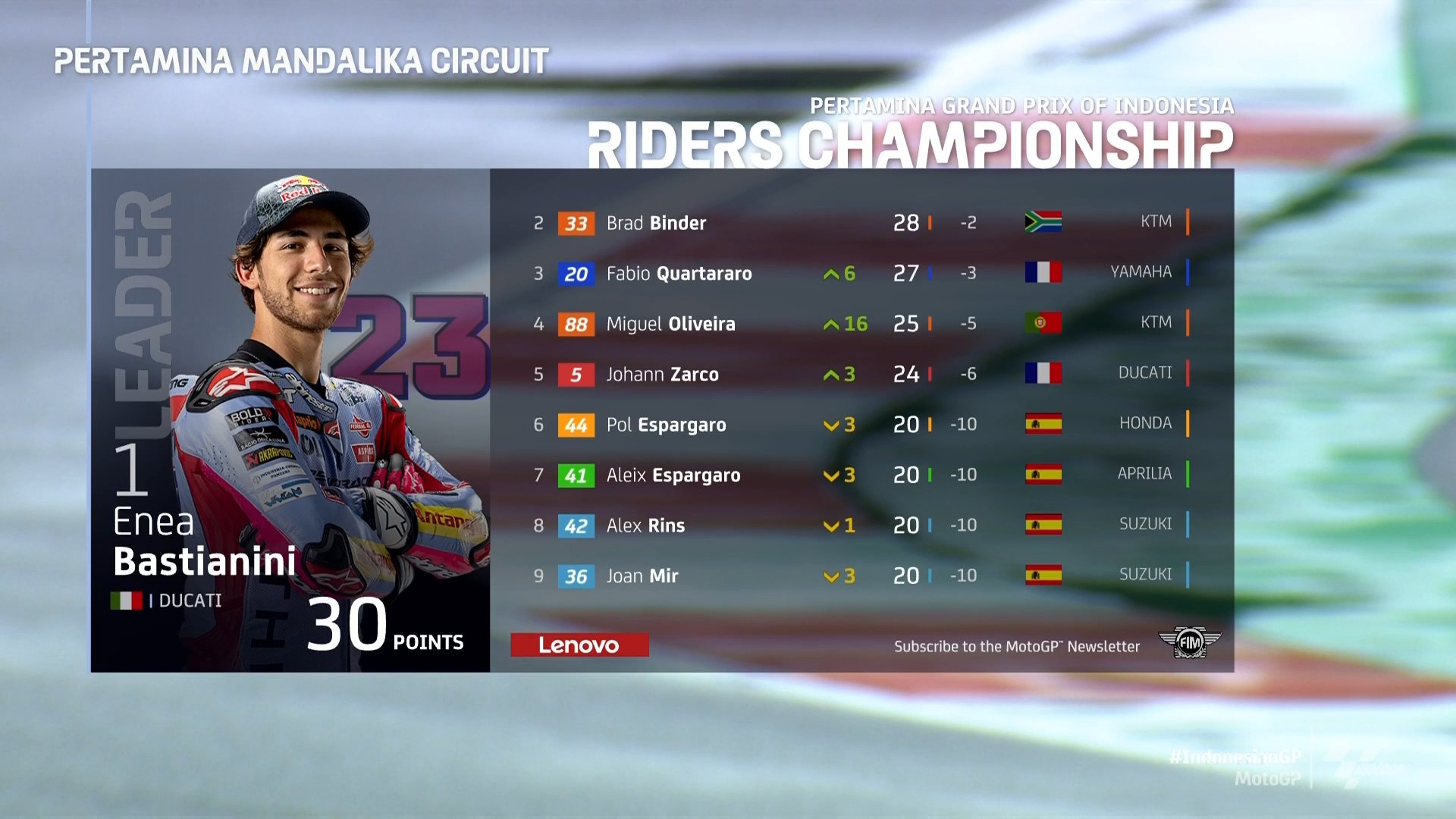 巴斯蒂亚尼尼继续领跑积分榜,布拉德·宾德依旧排名第二,本场夺得第二名的法比奥·夸塔拉罗升至第三位