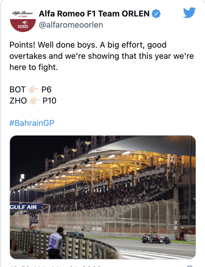 阿尔法罗密欧车队发布推特,庆祝两位车手揭幕战双积分完赛。