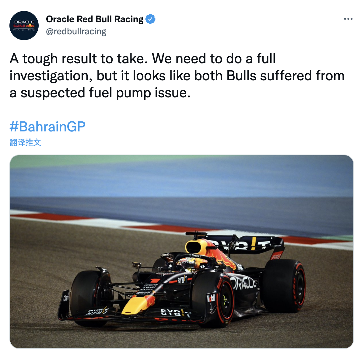 红牛车队在比赛结束后发推,表示需要全面调查比赛中的问题出在哪里。但看上去两辆赛车都遭遇了燃油泵问题。